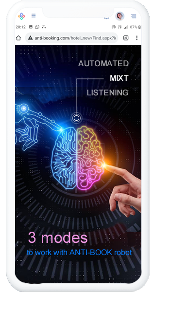 Therefore, we've made ANTI-BOOK capable of working alone [Automated mode], to team-up with hoteliers [Mixt mode] or to release to hoteliers all actions [Manual mode].