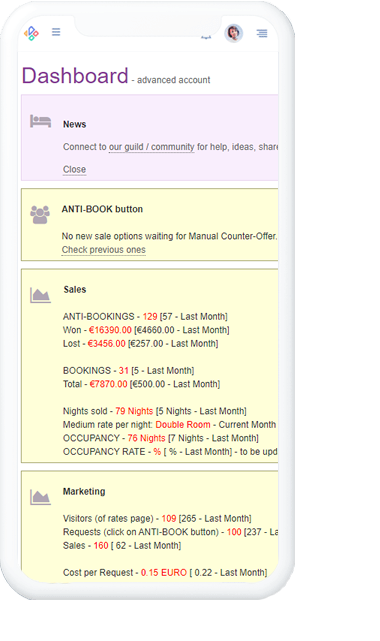 Since the ANTI-BOOK button is antifragile - capable to gain from disorder (processing the uncertainty, volatility, stressors and historical related data) it may help you to sell only to the most profitable sale option it discovers. Or, sell dynamically - when you're at 10-20% Occupancy Rate sell for a little bit lower rate or with some free added Extras and increase the rates later when your Occupancy Rate increased too.